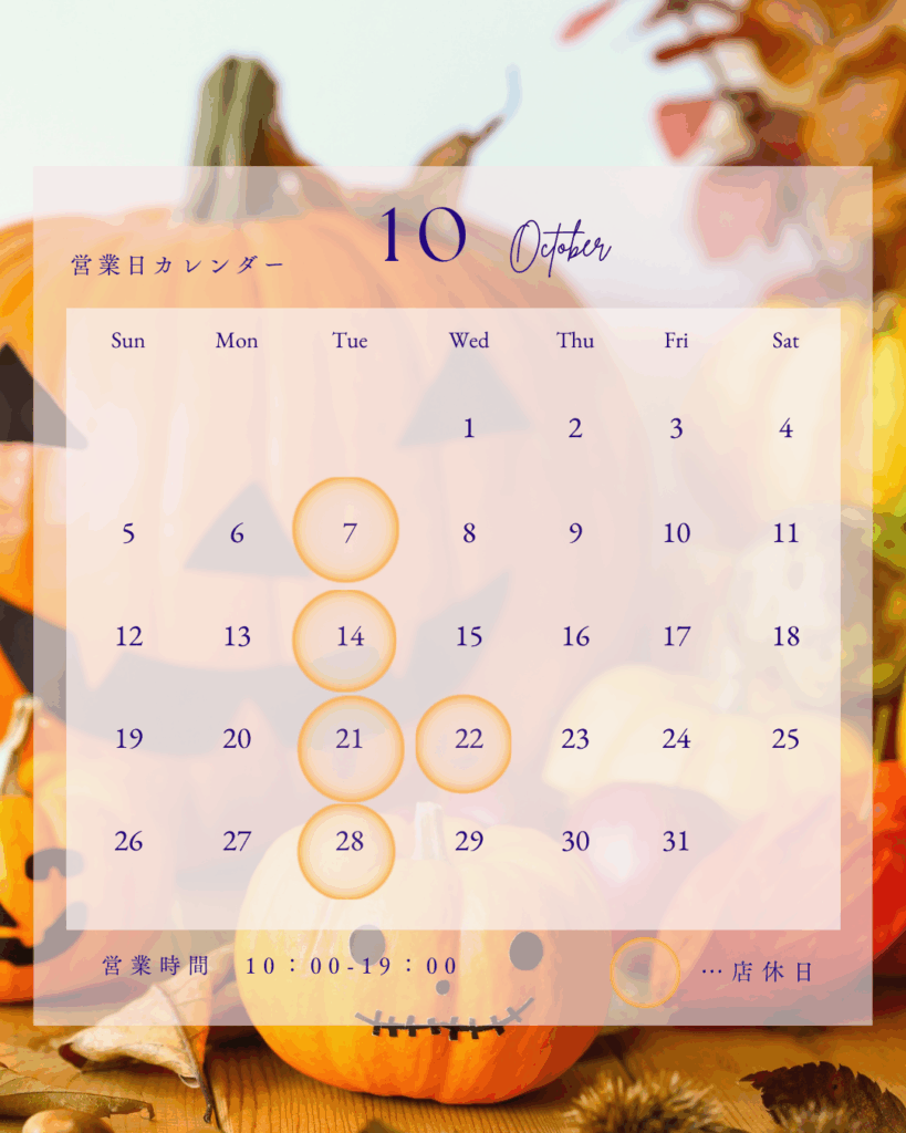 10月の営業日カレンダー ホームその他 タグ: その他 10月の店休日のお知らせです🌿 毎週火曜日をお休みいたします。 加えて、22日(水曜日)にお休みをいただきますので21、22日は連休となります。 変則となり申し訳ありません🙇♀️ 秋限定の商品も揃えて、皆さまのご来店をお待ちしております🦉 投稿者 patisseriechouette@outlook.jp 関連投稿 タグ: その他 2026年1月の営業日カレンダー 2025-12-30 0 1月の店休日のお知らせです🌿 毎週火曜日のお... すべて読む タグ: その他 12月の営業日カレンダー 2025-11-26 0 12月の店休日のお知らせです🌿 毎週火曜日を... すべて読む タグ: その他 太秋柿のショートケーキ 2025-11-17 0 先日、田主丸のおいしい柿をご紹介いただきまし... すべて読む タグ: その他 11月の営業日カレンダー 2025-10-30 0 11月の店休日、並びに閉店時間の一部変更のお... すべて読む タグ: その他 栗のラウンドケーキ 2025-10-26 0 いつまでも暑い…っと思っていたら急に涼しく…... すべて読む タグ: その他 栗とカシスのタルト 2025-09-20 0 ようやく朝夕の風が涼しくなり秋めいてまいりま... すべて読む 投稿ナビゲーション 前の投稿次の投稿