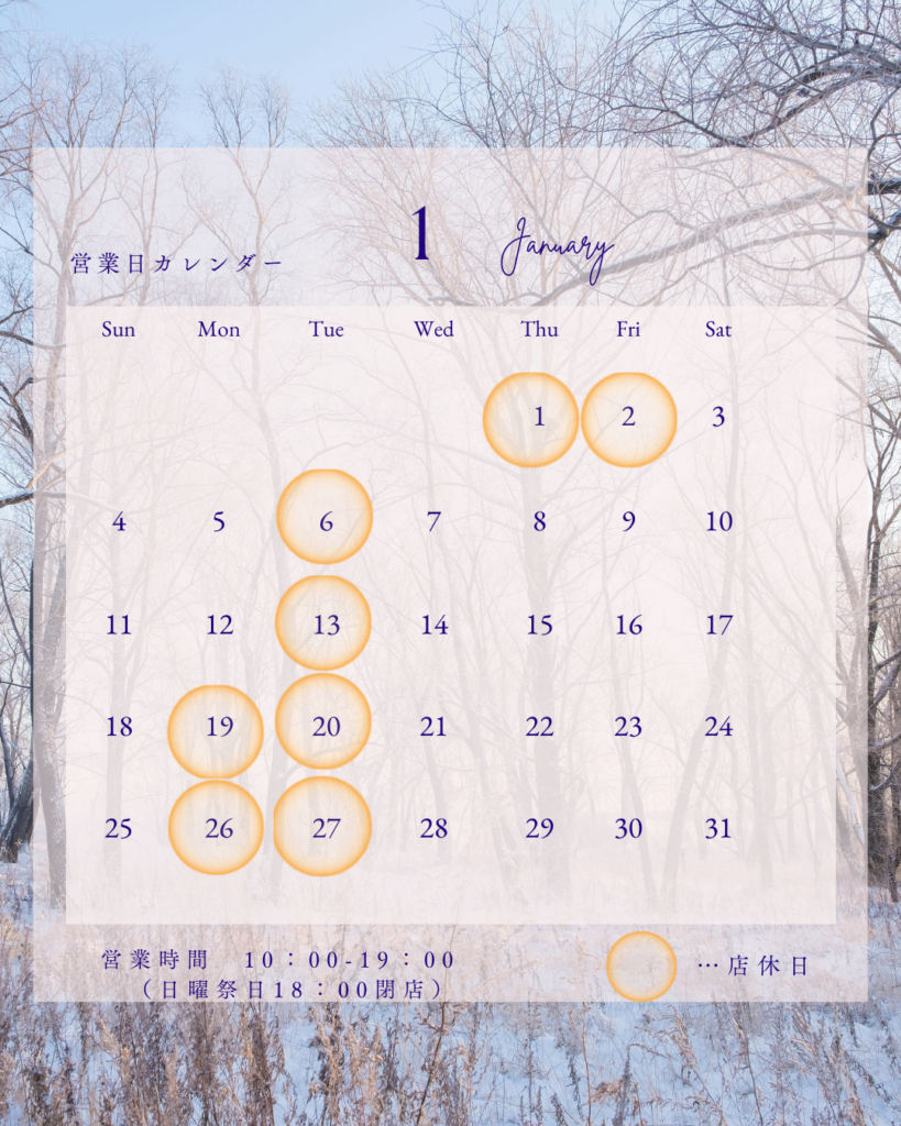 2026年1月の営業日カレンダー ホームその他 タグ: その他 1月の店休日のお知らせです🌿 毎週火曜日のお休みに加えて お正月休みに元旦と2日🎍 19日(月)、26日((月)をお休みさせていただきます。 尚、31日は15時閉店。 初売りは3日、10:00~17:00の営業でございます。 どうぞ新しい年もよろしくお願いいたします。 皆さまのご来店を心よりお待ちしております🦉 投稿者 patisseriechouette@outlook.jp 関連投稿 タグ: その他 12月の営業日カレンダー 2025-11-26 0 12月の店休日のお知らせです🌿 毎週火曜日を... すべて読む タグ: その他 太秋柿のショートケーキ 2025-11-17 0 先日、田主丸のおいしい柿をご紹介いただきまし... すべて読む タグ: その他 11月の営業日カレンダー 2025-10-30 0 11月の店休日、並びに閉店時間の一部変更のお... すべて読む タグ: その他 栗のラウンドケーキ 2025-10-26 0 いつまでも暑い…っと思っていたら急に涼しく…... すべて読む タグ: その他 10月の営業日カレンダー 2025-09-30 0 10月の店休日のお知らせです🌿 毎週火曜日を... すべて読む タグ: その他 栗とカシスのタルト 2025-09-20 0 ようやく朝夕の風が涼しくなり秋めいてまいりま... すべて読む 投稿ナビゲーション 前の投稿